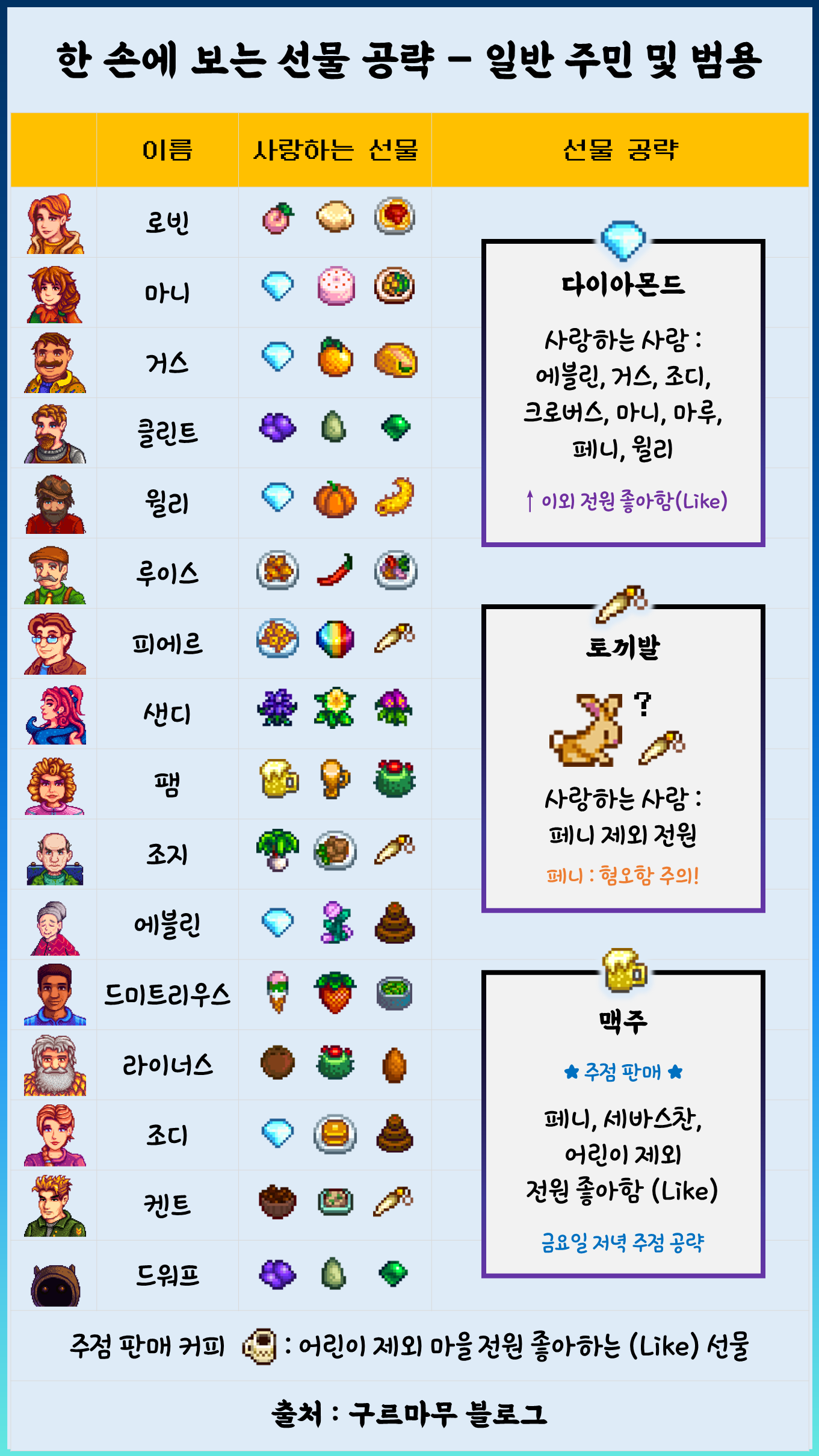 [ 스타듀밸리 공략 ] 한 손에 보는 NPC 주민 호감도 선물 공략 / 보편적으로 사랑하는 선물/ 커피 / 맥주 / 토끼발 / 다이아몬드 / 배경화면